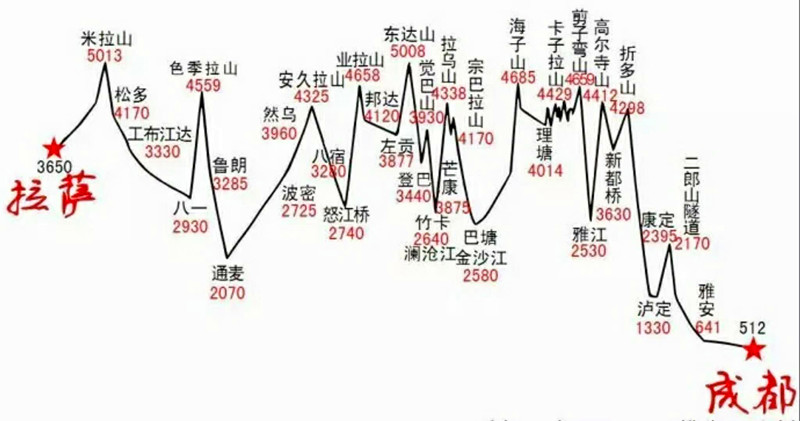 成都—丹巴或海螺溝—新都橋—稻城—日瓦(景區門口)—亞丁村一日游—稻城—理塘—芒康—邦達—八宿—來古冰川—波密—通麥大橋—八一(林芝)—工布江達—拉薩