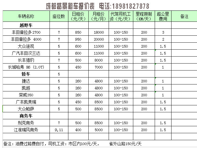 在租車之前一般大家對價格也比較關注,為了幫助大家快速了解當成都租車價格行情,我們整理了一份汽車租賃報價表給大家,以下價格表僅供參考: